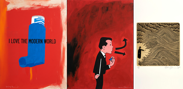 スクリーンプリント、エッチング銅版、エッチングとミクストメディアのペインティング、という3つのシリーズで構成された本展では、ロンドンの象徴的な建物が崩壊した黙示録的な作品や日本の楮和紙を使用したスケールの大きい作品など、手法ごとに異なるメッセージが込められた見応え充分な内容となっている。