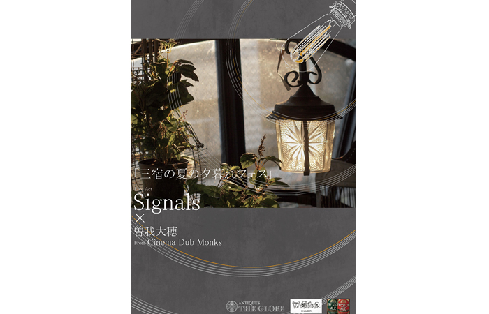 照井利幸と椎野恭一の二人をコアとし随時ゲストメンバーを迎え入れることで、より自由で発展的なプロジェクトとして活動をしているSignals。そして即興演奏を交えた音楽と映像を融合させたパフォーマンスに定評のあるCinema Dub Monksの曽我大穂。意外とも言える組み合わせの両者によるライブイベントが8月6日(土)、「三宿の夏の夕暮れフェス」と題して三宿の交差点近くにあるカフェを併設したアンティークショップ「ANTIQUES THE GLOBE」にて開催される。
