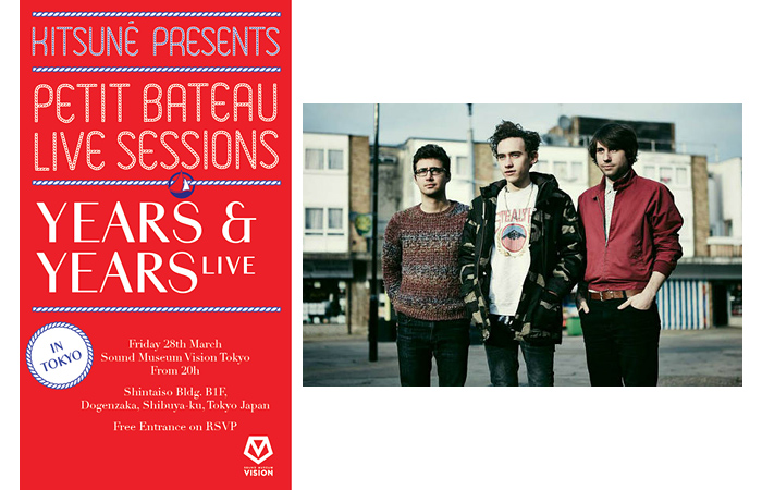 このイベントは、去年の9月のパリ ファッション ウィーク期間中にChloé Howlをフィーチャーして大盛況だったイベントで、今回は場所を東京に移し渋谷のSOUND MUSEUM VISIONで行われる。 KITSUNÉ のミュージック レーベルが一押しするアーティスト「YEARS&YEARS」が来日し、ライブパフォーマンスを披露。「YEARS&YEARS」はロンドン出身の3人組の音楽ユニットで、R&Bを思わせる心地良いボーカルに、シンプルなメロディーラインにシンセが絡まる、デジタルなビートが特徴。全体的に、KITSUNÉのテイストを感じさせる洗練されたトラックで知られている。