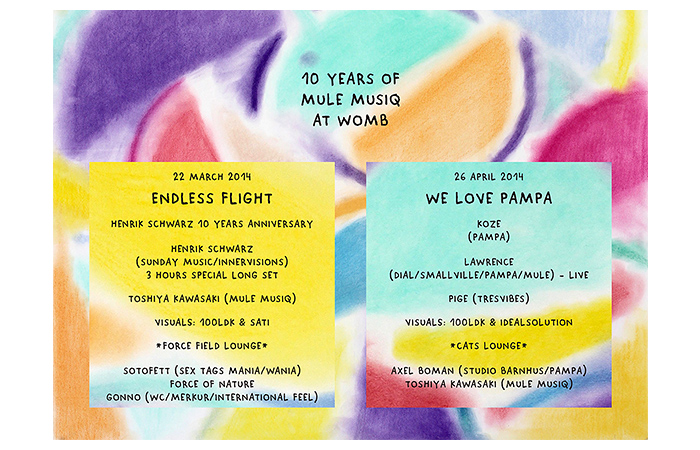 そして2014年4月26日(土)にはその第二弾、『we love Pampa』が開催。メインフロアにはmule musiqと同様に世界的な評価を得るレーベルPampaのボス・DJ Koze、そして看板アーティストのLawrenceが出演。また4階の"cats lounge"には、同じくpampa所属アーティストのAxel Bomanに加え、mule musiq主宰のToshiya Kawasakiが登場する。