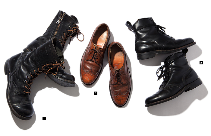 例えば、写真左のジャンプブーツは、比較的古い年代のもので、木型が細みであることが特徴で、現行品にはないよさがある。ただし街履きとなると着脱が厳しいという難点が必ずつきまとう。そこでジップは、ヴィンテージのタロン社のファスナーを取り付けることで、この弱点をうまく解決している。さらにシューレースをブラウンのレザーに変えることで装飾面と雰囲気を高めている。なによりジップ自身がこのブーツのコレクターでもあるため、極めて象徴性の強い一足となっている。続いて、中央のウイングチップのシューズは、消耗されたソールをオリジナルとまったく別のレザーソールに張り替え、やりすぎない加減でドレスのカラーを加えている。右側のミリタリーブーツも着脱をスムーズにすることを目的にショート丈にカット。切り口を処理するためのパイピングのラインも美しくまとまっている。