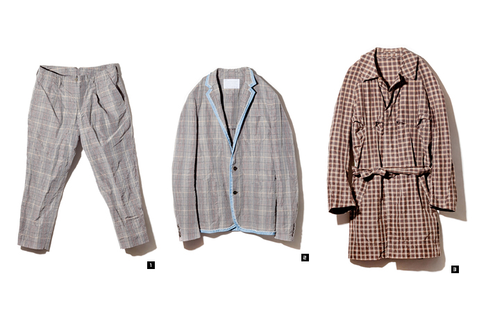 市場での二ーズも高いテーラードジャケットは、ヴィンテージ風の加工のデニムのパイピングや素材に洗いをかけることで、クリーンなイメージのグレンチェックをラフに仕上げている。共地で製作したブランドの定番アイテムである九分丈のクロップドパンツは、スーツとしてジャケットと着こなしても決まりすぎない抜け感が持ち味である。ブラウン系のチェックが目を引くトレンチコートは、クラシックなスタイルを踏襲しつつも、ヨークやベルトのバランスと独特の生地感によってモダンな印象をつくっている。