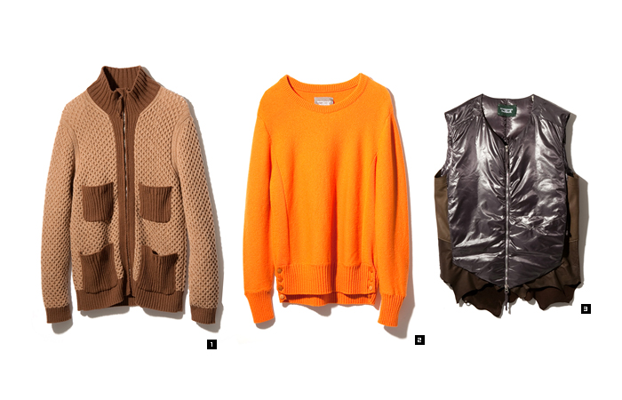 ジャケットのインナーとしても着用できるジャージーのようなカーディガンは、機械織りの特徴を活かしながら、さらなるパターン追求により理想的なフィット感を実現させたユニークな一枚。オレンジのクールネックのニットは編み方を通常とは逆にした独創的な手法で製作している。発色のよさやボタンの風合いなど、そのこだわりは枚挙が尽きないが、最大の特徴はクラシカルなスタイルのリエディットから生まれた汎用性の高さにある。最後は今季のコレクションのなかでも象徴的なダウンのシリーズからベストをセレクト。宮下の実体験から実用性を意識し、軽く温かいホワイトグースを90%、通気性のよいフェザー10%を合わせることで、インナーとして着用できる快適な着心地を実現。ナイロンは強度と光沢があり、ディアスキンの端革を取り入れ方も独特だといえる。