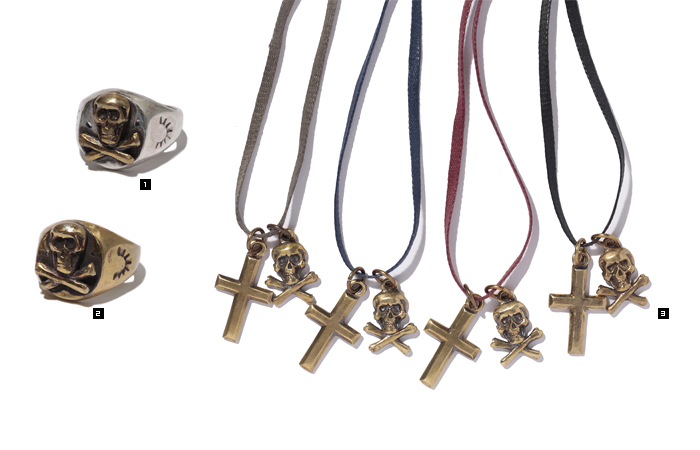 両ブランドのシンボリックアイコンのひとつであるスカル&ボーンズをモチーフに制作されたアイテムは、ピンキーリングとアクセサリー。まずピンキーリングは、ビンテージのトイリングをイメージソースに、どこかコミカルに仕上がったスカルの表情が特徴。風合い豊かなブラスと、シルバー×ブラスの2素材で展開。そして、クロス&クロスボーンのトップのコンビネーションがポイントになったアクセサリーは、サイズ調整することによって、ネックレスにもなる2WAY仕様。シルバービーズやブランドタグといったディテールワークはもちろん、豊富なカラーリングなど魅力が満載。