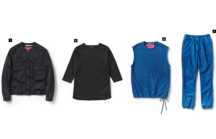 一つは植物の実や根、花などの天然素材を用いた日本古来の技法である草木染め。今回は良質な水に恵まれた、京都の京洛染めを採用。深みがあり表情豊かな黒は、天然染料ならでは。もう一つは、沖縄産の藍を使用し、京都の職人が加工した琉球藍染め。赤みが少なく、爽やかな青が特徴的。ジャケット2型、ベスト1型、カットソー2型、パンツ3型を、それぞれのカラーで展開する。