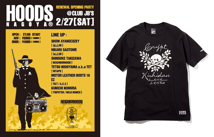 NEIGHBORHOODとWTAPSを取り扱うショップ「HOODS NAGOYA」が、2月6日にリニューアルオープン。それを記念して、2月27日(土)に名古屋のCLUB JB'Sで、HOODS NAGOYAのリニューアルオープニングパーティが開催されることになった。