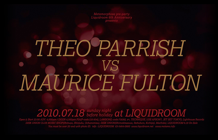 恵比寿移転6周年となるLIQUIDROOMと今年で10周年目となる日本最大のオールナイト野外ミュージックフェス、METAMORPHOSEのチーム・アップで行われる今回のスペシャル・パーティは、THEO PARRISHに加え、どす黒いグルーブを司るDJ、MAURICE FULTONも登場、THEO PARRISHとMAURICE FULTONによるタイマンDJパーティとなる。
